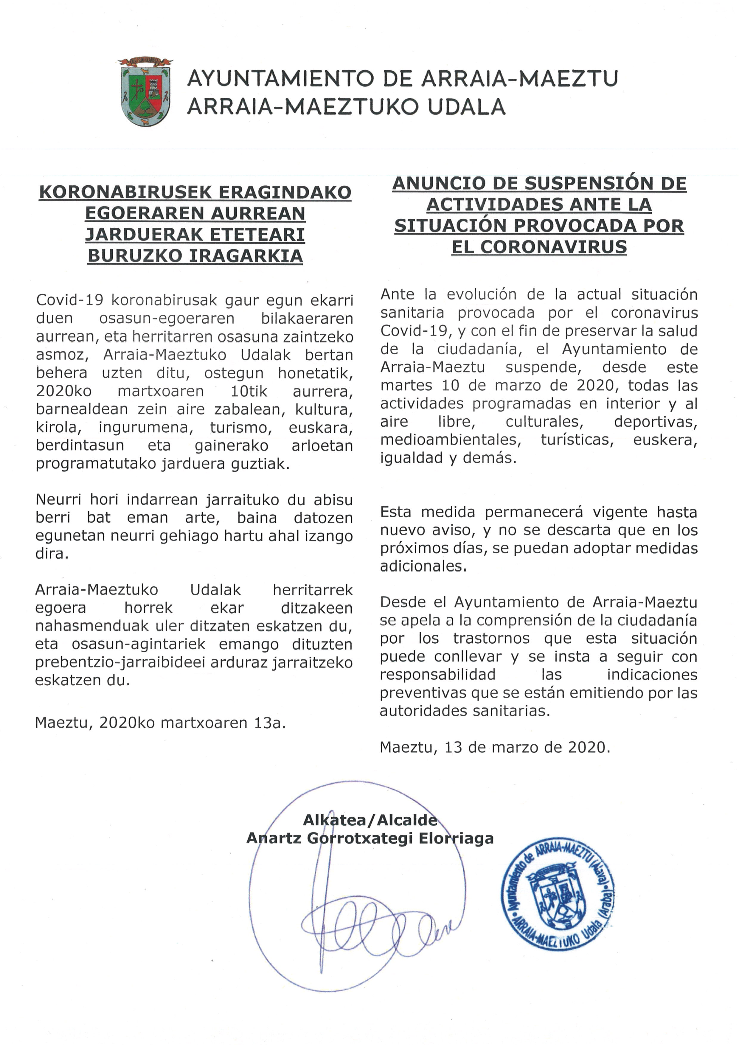 Anuncio de suspensión de la actividades ante la situación provocada por el coronavirus (Ayuntamiento de Arraia-Maeztu)
